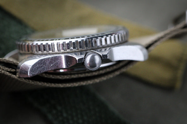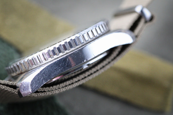 1981 – Case switches to an M.R.P. SA case. Dial signed with slightly larger CWC logo with medium circled T below the hands; SWISS MADE below the 6 index; luminous indices and 3, 6 and 9 numerals; acrylic bezel insert with luminous triangle and numbers. Fitted with an ETA 2872 automatic movement. Approximately 100 watches were issued in this year.