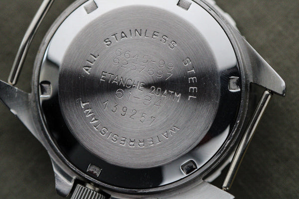 The handset is similar to the 1980 dive watch, and the dial has a very small circled T below the central pinion and luminous numbers 3, 6 and 9, both features only found on the 1980 dial made by Dodane.