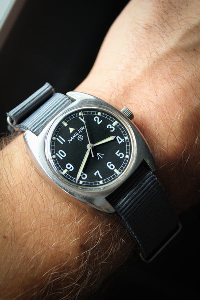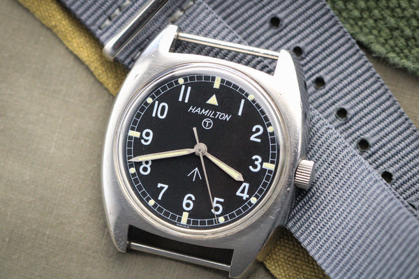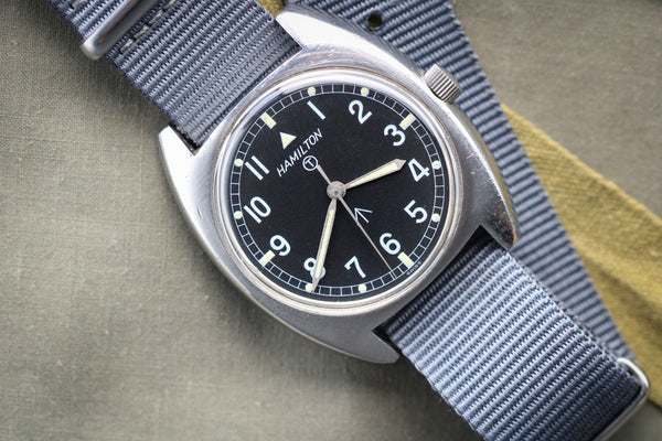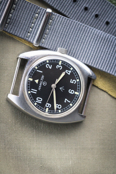 This, 1st year of production, Royal Navy issue Hamilton "W10" is very seldom seen, although the numbers of production do not seem to be known, with members of the MWR Forum estimating a small batch of around 100/150 pieces delivered in 1973 with only currently 5 known.
