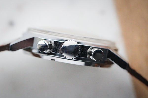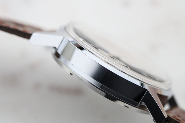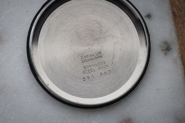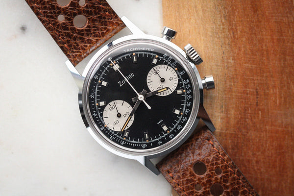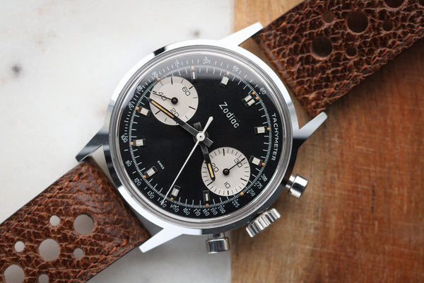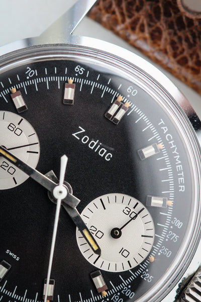 This Zodiac has all the elements of a great, function-forward 1960s chronograph, with a wearable 36mm diameter. The dial is executed in a reverse panda style, with engine turned registers, legible matchstick hands, and a white central seconds hand. These Zodiac chronographs from the 1960s are often referred to as a "poor man's" Heuer Carrera, due to their shared resemblance to Heuer chronographs of that era. Zodiac was one of a few companies at the time that offered similar but more economical options compared to the highly recognizable Heuer classic.